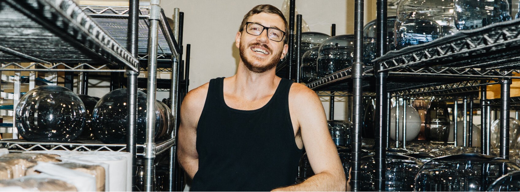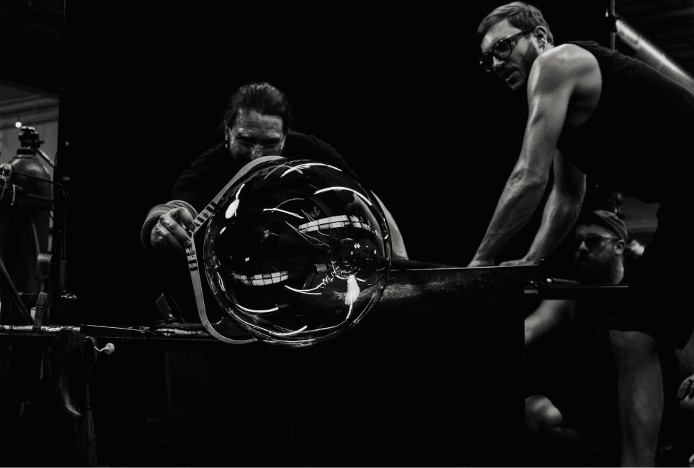 Dave was eight years old when he started blowing glass in his dad’s studio. His family’s bread and butter was selling their glass pieces at art fairs and from their studio. Perhaps it was a rebellious phase, but Dave first started college as a music major, whailing on the saxophone. It wasn’t long before he gave up blowing horns for blowing glass. Everything changed when he met glassblowers Joe and Kevin. Finding comfort in working with the two fun loving glassblowers, Dave felt more at ease as part of a team. Dave had been wary for a long time of the inconsistency and instability that often comes with being a solo artist. As it turns out, there was stability in numbers—and success too.