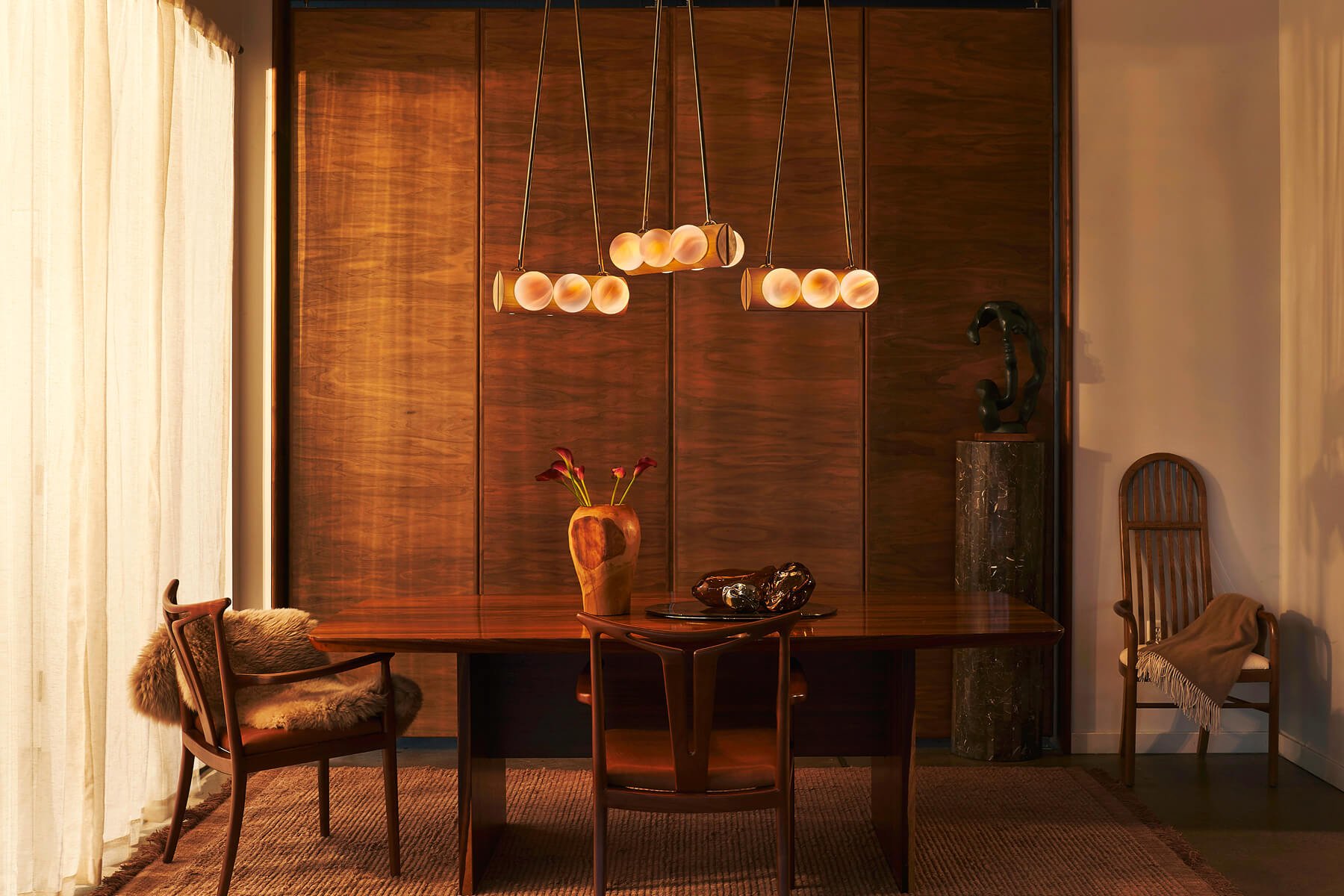 The Nested Collection was inspired by the real and surreal beauty of the midwest. Layers of color are masterfully applied to create organic marbling in the glass as the motion of the maker’s hand becomes part of the pattern. Glass shades are nestled in a solid wood base carved from native species hardwood and suspended from refined brass hardware hand finished in house. Functions beautifully alone or in multiples. 2700 lumens.