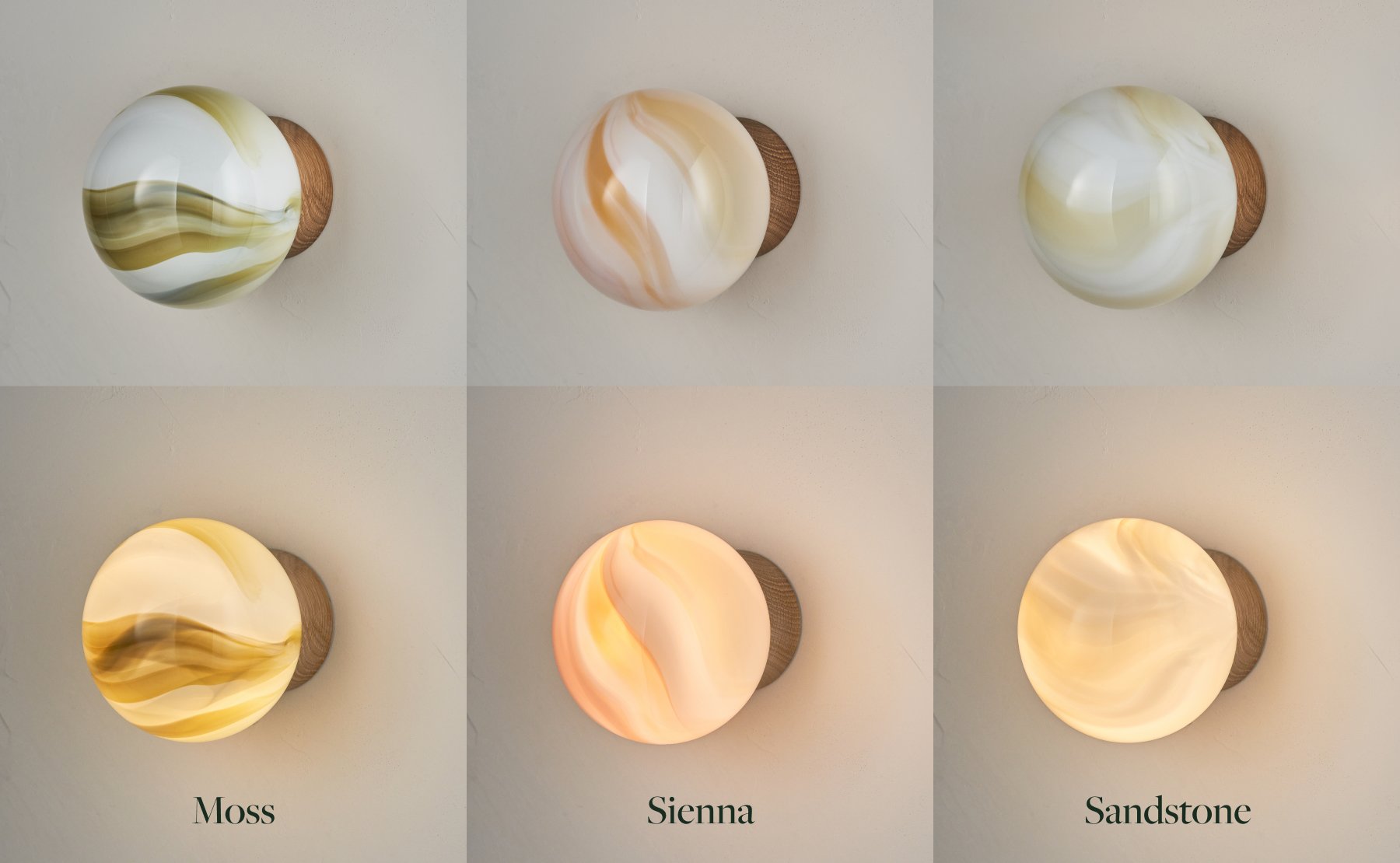 The glass spheres are singular creations, each showcasing rich veins and delicate variations reminiscent of natural stone. Native species hardwood cradles each sphere in a nest-like form, the natural wood grain complementing the marble pattern of the glass. When illuminated, the spheres come alive, revealing their striations with stunning depth and layered richness.