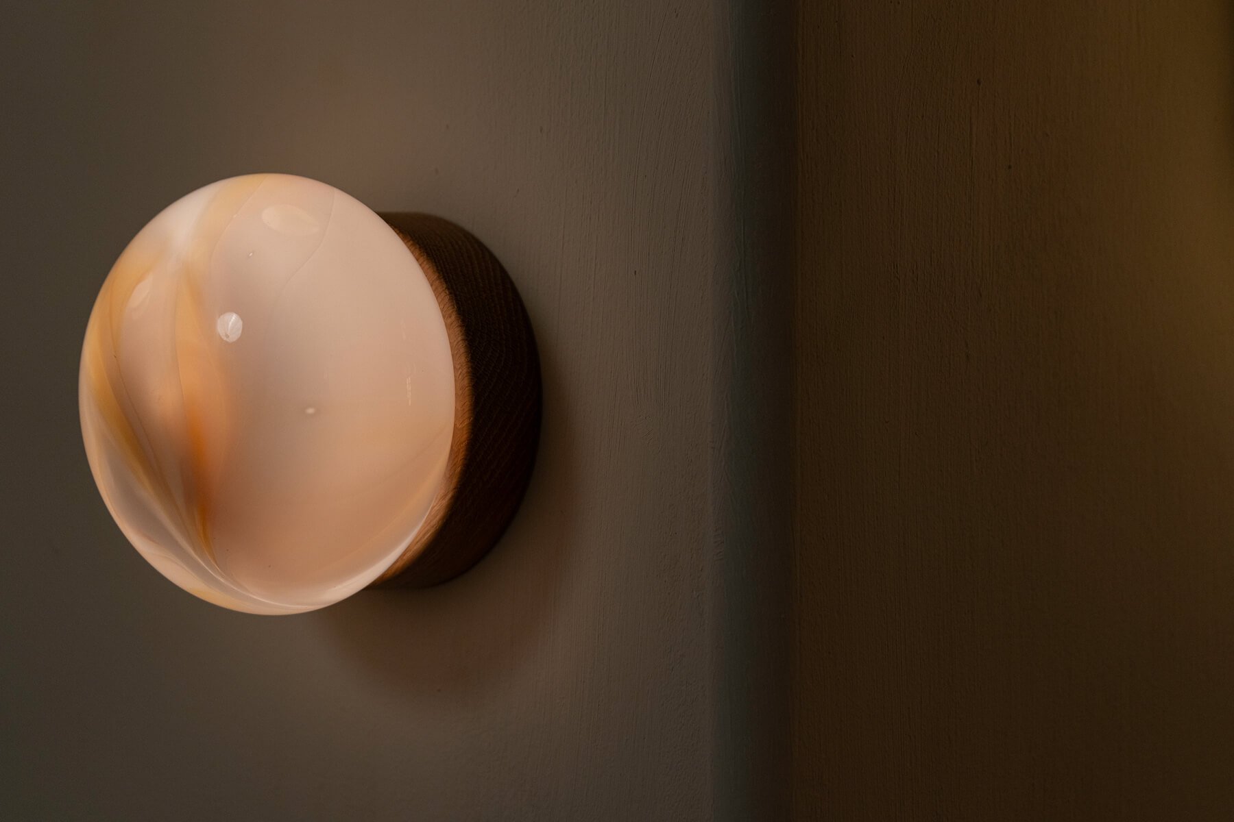 The glass spheres are singular creations, each showcasing rich veins and delicate variations reminiscent of natural stone. Native species hardwood cradles each sphere in a nest-like form, the natural wood grain complementing the marble pattern of the glass. When illuminated, the spheres come alive, revealing their striations with stunning depth and layered richness.