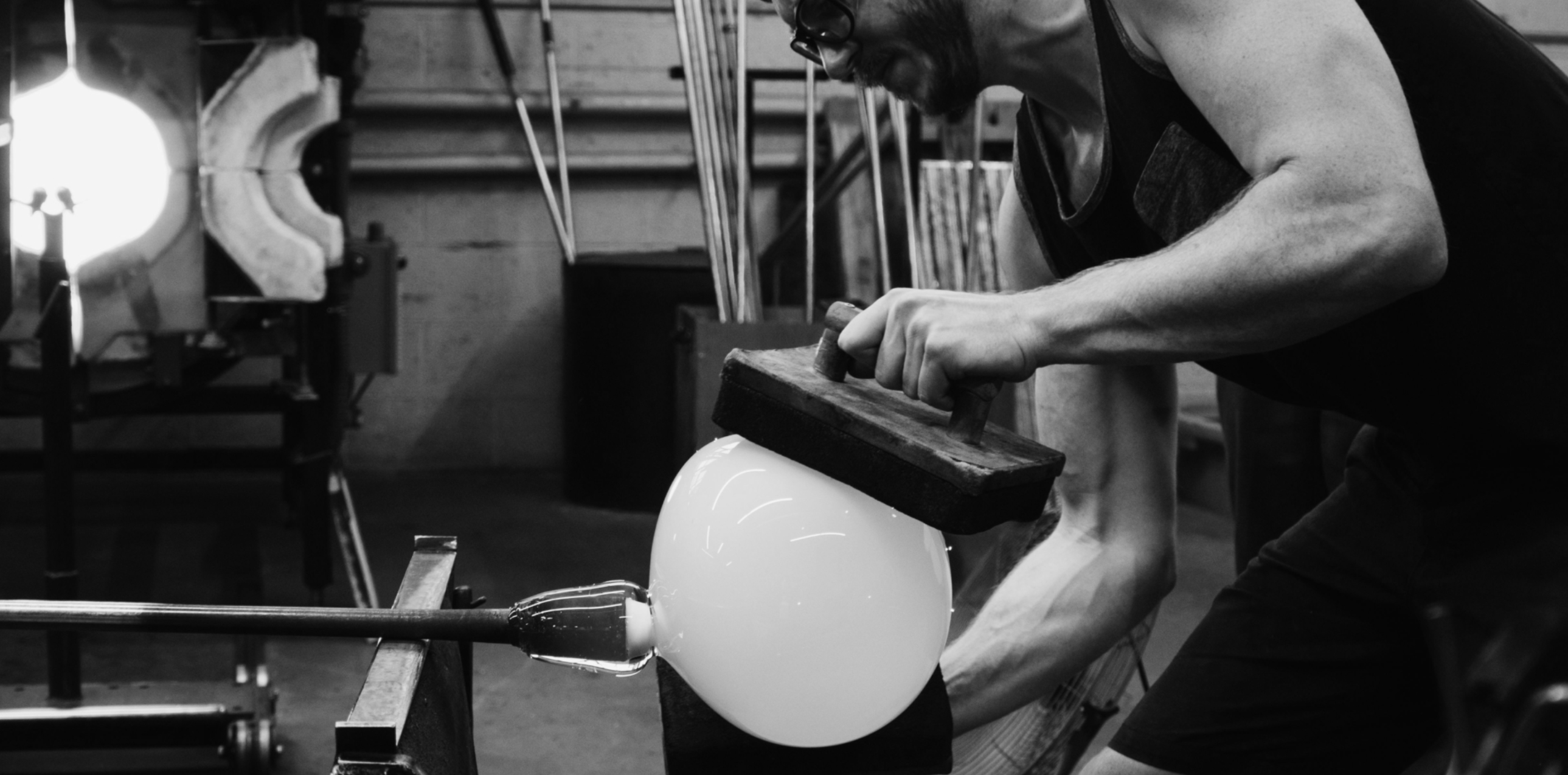 Makers Notes: Each piece undergoes several processes to achieve their unique qualities. At the start, multiple layers of clear, sustainable glass are added to a core of opal white glass. The pieces are then shaped using a variety of hand tools, gravity and air pressure. To transform the once symmetrical sphere into a soft, organic form, each Lacuna piece is treated by hand with cork. Little of the hardware is exposed, though it is designed to make installation easy.