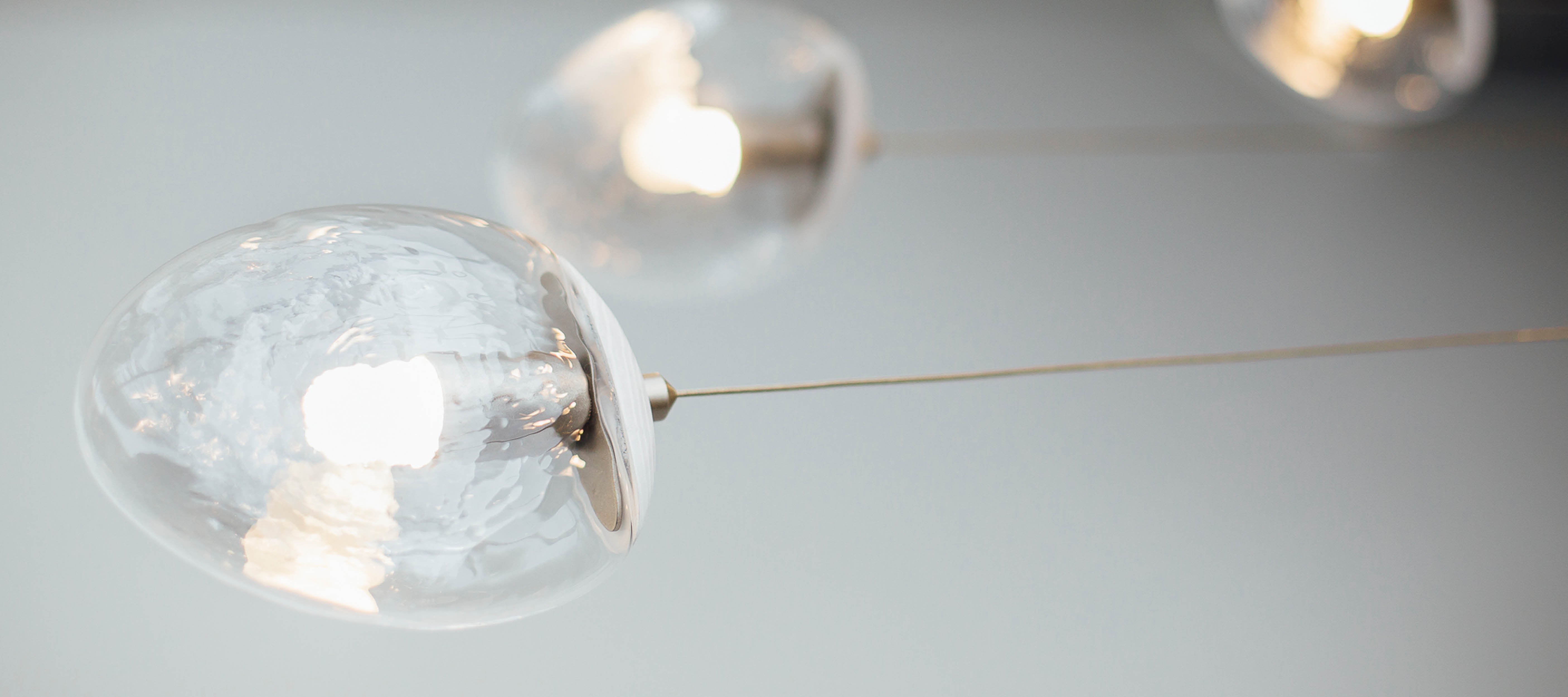 The Foliole Pendant comes from a simple interpretation of a leaf form. Its flattened shape has rich texture in the glass, diffusing and shifting the light as it radiates from the fixture. Hanging from a thin delicate wire, this fixture’s tailored finishes and materials provide a delicate solution for any type of space.