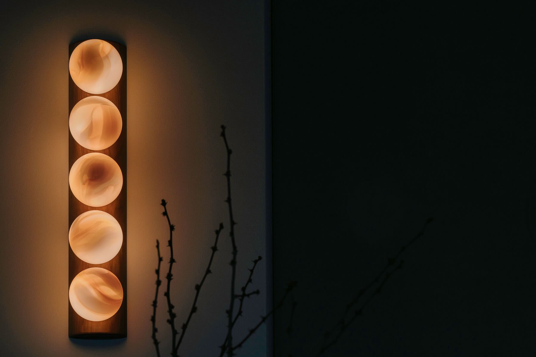The glass spheres are singular creations, each showcasing rich veins and delicate variations reminiscent of natural stone. Native species hardwood cradles each sphere in a nest-like form, the natural wood grain complementing the marble pattern of the glass. When illuminated, the spheres come alive, revealing their striations with stunning depth and layered richness.