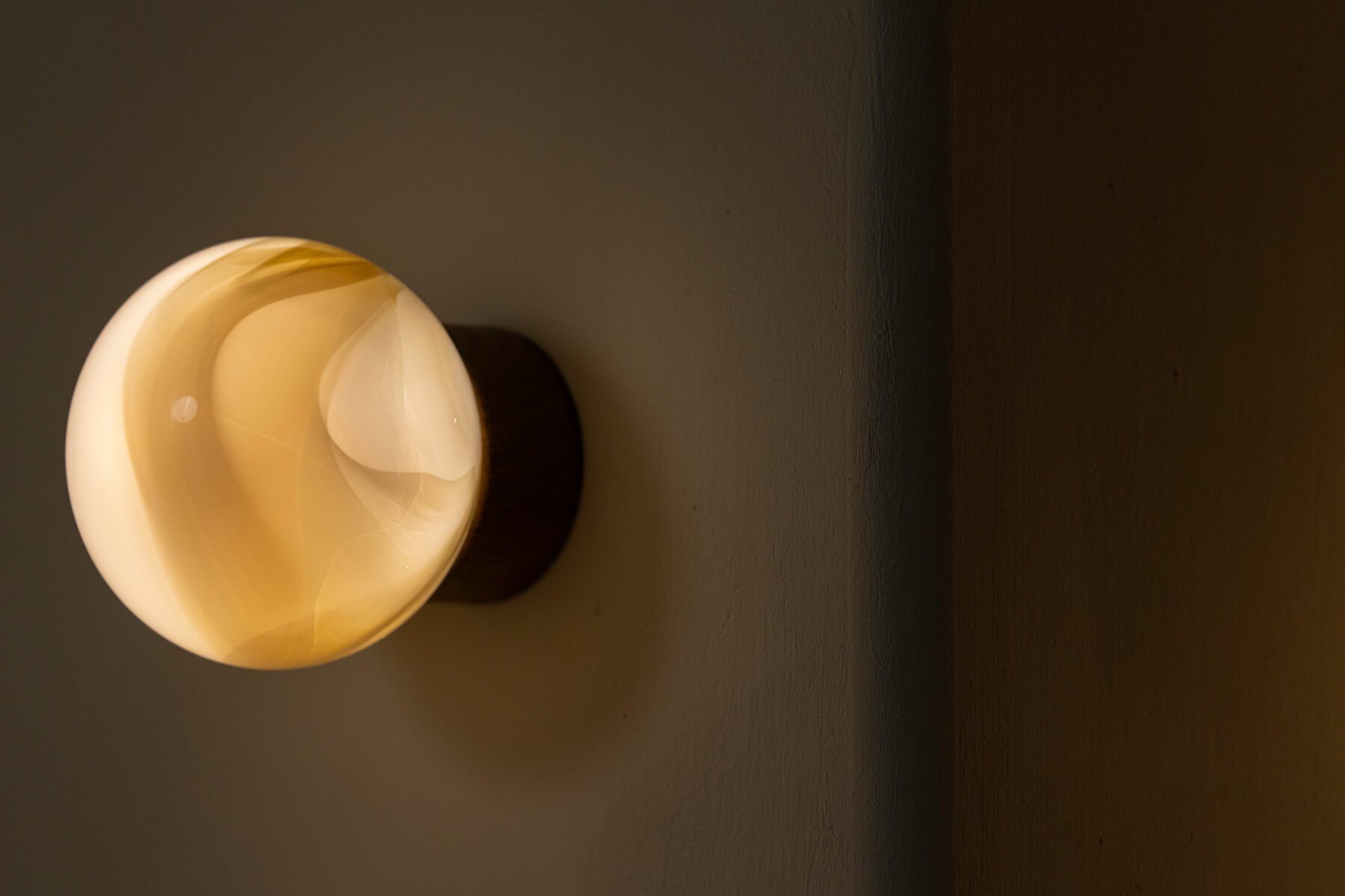 The glass spheres are singular creations, each showcasing rich veins and delicate variations reminiscent of natural stone. Native species hardwood cradles each sphere in a nest-like form, the natural wood grain complementing the marble pattern of the glass. When illuminated, the spheres come alive, revealing their striations with stunning depth and layered richness.