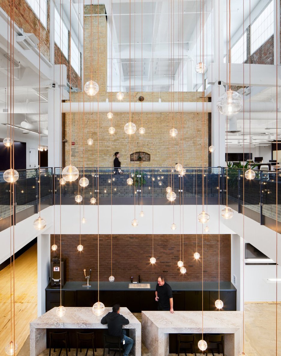 Sixty Halo pendants cascade three stories at OurFamilyWizard’s headquarters in Minneapolis. Design by Studio BV, Photo by Gaffer Photography.