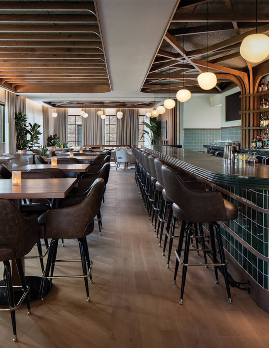 Nestled in the charming town of Ada, Michigan, the new Ada Hotel offers a welcoming blend of luxury and comfort. At its heart is the Post Tavern, a social hub for gathering and Rix, an inviting dining destination featuring locally sourced ingredients and creative menus. Ada Hotel is crafted in warmth and home to true midwestern hospitality. Lacuna Pendants with minimal mounting hardware create a seamless transition at the Ada Hotel’s Post Tavern.