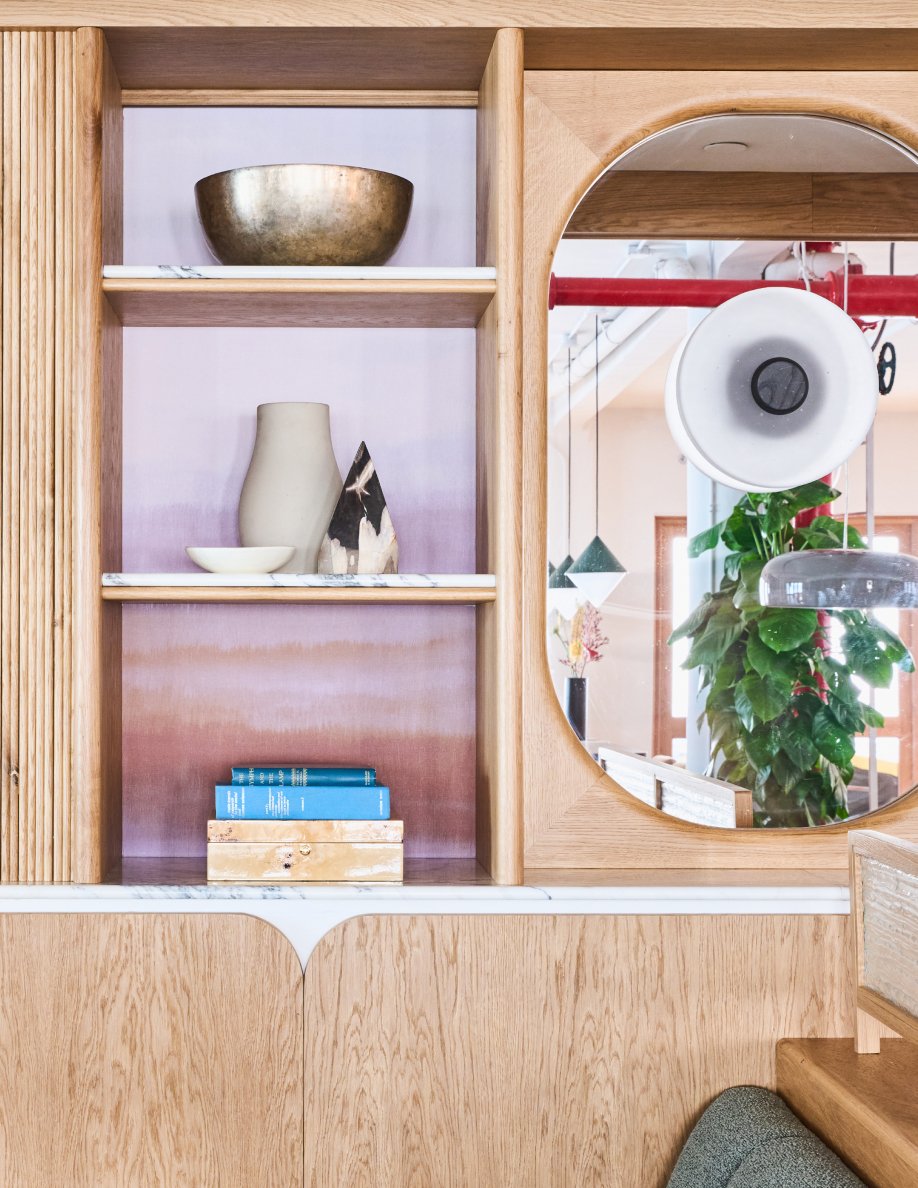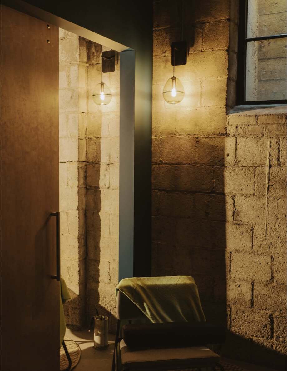 (1) Lacuna pendants punctuate each booth, accentuating the natural material selections. (2) Bruma sconces centered on mirrors complete the vignette. (3-4) Taku Sconce and Parallel Wide Cylinder playfully integrate handmade lighting into artistic spaces.